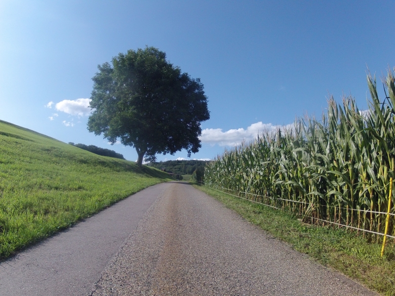 Für meine heutige Runde fuhr ich wieder einmal in die nördliche Richtung. Wie üblich etwas hinten durch, neben den grossen Strassen, den Waldrändern entlang. Vom gestrigen Sturm lag einiges an abgeschlagenem Holz auf der Strasse herum. Meist zwar nur eher kleine Äste, aber vielfach auch Äste mit noch grünen Blättern daran.