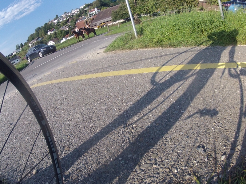 Weniger süss war, dass ich irgendwo bei der Fahrt über die Kieswege oder allenfalls bei der Fahrt über das herumliegende Heu und dürre Gras am Strassenrand, Dornen aufgelesen hatte. Ein Schleicher im Vorderrad machte sich bemerkbar. Langsam wurde es immer weicher und schwammiger.