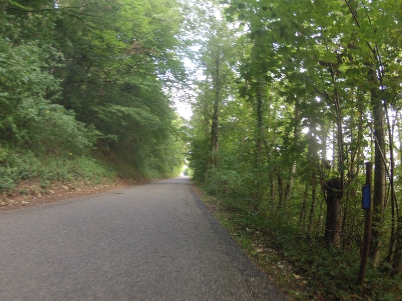 Nach einer Aufwärmrunde im Aaretal begann ich mit dem Aufstieg auf den Bözberg. Auf der südlichen Seite, also über dem Aaretal, war der Himmel ziemlich bewölkt. Mit der Überfahrt über den Bözberg und die Abfahrt hinunter ins Fricktal kam ich plötzlich wieder an die Sonne. Aber ich hatte keine Lust, auf dem üblichen Weg bis nach Eiken und dann mehr oder weniger dem Rhein entlang wieder aufwärts zu fahren. Ich wollte etwas anderes. Deshalb verliess ich oberhalb Hornussen den Radweg und fuhr einfach gerade aus weiter. Nach einem kurzen Stück Kiesstrasse gelangte ich wieder in den Wald zurück.