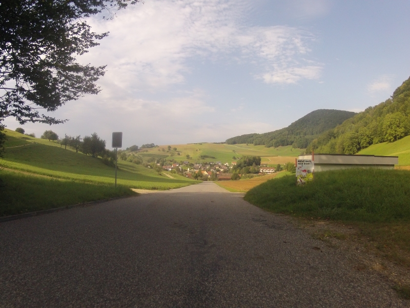 Danach ging es nicht mehr ganz so steil, aber immer noch spürbar hinunter nach Kaisten. Damit hatte ich eine etwas kürzere Variante gefunden, um an den Rhein zu gelangen. Sie ergibt zwar deutlich mehr Höhenmeter als das Dreieck Bözen – Eiken- Kaisten, dürfte aber auch deutlich kürzer sein.