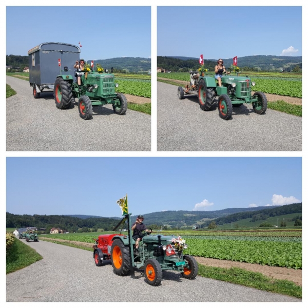 Später am Nachmittag, ich fuhr gerade um Winterthur herum, sind mir diese drei wieder begegnet. Es würde mich nicht wundern, wenn die drei auf dem Heimweg vom gestrigen Traktoren-Oltimer-Treffen in Möriken gewesen sind. Der Vorderste trägt eine Thurgauer-Fahne. Ich glaube alle drei hatten auch eine Thurgauer – Nummer am Fahrzeug. Interessant waren ihre Anhänger. Der erste vielleicht eine Feuerspritze, der zweite ein Wagen mit allerlei Gebrauchsgegenständen, der dritte mit einem Anhänger. Ich wäre deshalb nicht erstaunt, wenn die drei aus dem Traktoren-Oldtimer-Treffen in Möriken gleich einen persönlichen Event gemacht haben. So mit Camping (im dritten Anhänger) und allem was halt so dazu gehört. Hoffentlich hatten sie auch den Plausch bei diesem schönen und warmen Wetter.
