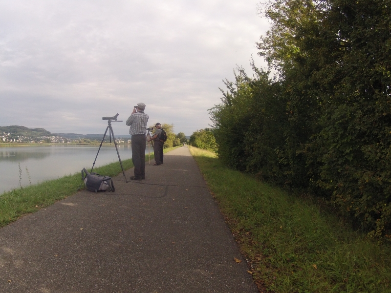 Da scheint heute einiges los zu sein. Auf dem Weg, wo es günstig ist auch direkt am Wasser, haben die Vogelbeobachter ihre Stative und Fotoapparate mit riesigen Teleskopen aufgestellt. Mit dem Feldstecher wird offensichtlich nach weiteren interessanten Objekten gesucht. Mit blossem Auge kann auch ich ein paar schneeweisse Silberreiher erkennen. “Unser” Schwanenpaar mit den beiden Jungen paddelt ebenfalls wieder dem Ufer entlang. Weiter draussen schwimmen jede Menge braun gefiederte Enten (oder Gänse?). Denke, das dürfte die Vogelbeobachter interessieren. Denn die Schutzzone Klingnauer Stausee wird gerade in dieser Zeit des Vogelzuges von manchen Wasservögeln als Zwischenstation auf ihrem Flug in den Süden benutzt.
