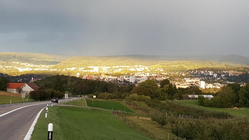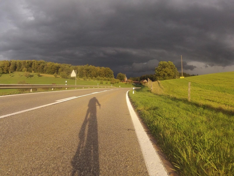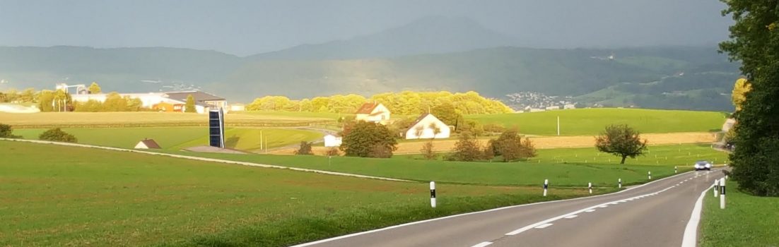Ich begann sofort mit dem Aufstieg auf den Bözberg. Vor mir die immer schwarzer werdende Passhöhe, von hinten setzte sich die Sonne langsam wieder durch. Ich wusste nicht recht, sollte ich mich beeilen, oder doch eher langsamer fahren? Beeilen macht wahrscheinlich keinen Sinn, damit würde ich sicherlich nach der Passhöhe mitten in den Regen hineinfahren.