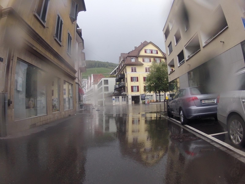 In der Nähe von Baden waren die Strassen richtig voll Wasser. Es hatte aber bereits wieder aufgehört zu regnen. Da hatte ich wohl wieder einmal Glück gehabt, und bin um den schlimmsten Regen herum gekommen. Weiter vorne schien dann sogar wieder die Sonne, auf die noch nassen Strassen.