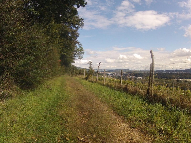 Der Weg führte nach einer steilen Aufstiegspassage durch den Wald bald wieder an einen Waldrand. Eingeklemmt zwischen Waldrand und Rebenhang musste ich noch ein paar Meter zurück fahren. Dabei kam ich zu einem schönen Panorama über das Aaretal. Das Geochache fand ich ziemlich schnell. Es war vom Besitzer allerdings etwas ungeschickt platziert. Der Regen der letzten Tage hatte alles aufgeweicht.