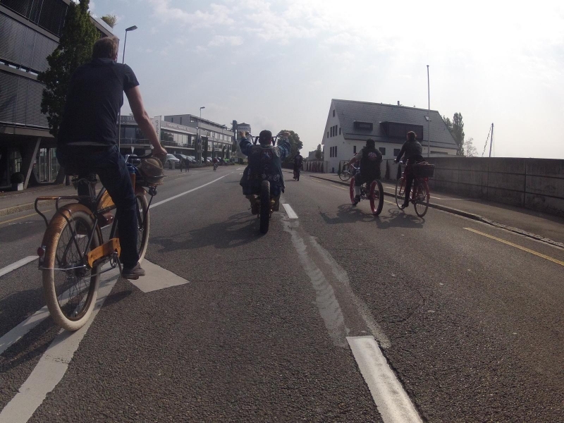 Vor allem der erste Teil des Slow Up’s, der Teil am Zürichsee vor dem Damm, war ein eigentliches Fest. Musik wurde an der Strecke gespielt, Kleinigkeiten wie Rivella, Flakes und Äpfel wurden von den Sponsoren verteilt. Am Anfang der Fahrt trafen wir ein paar Räder die eher an Harleys erinnerten, so im Cruiser-Style.