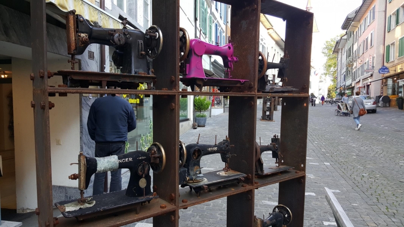 In Bremgarten dürfte es so weit sein. Ich entschloss mich deshalb hier zu wenden, überquerte etwas später die Reuss, die hier sehr viele Kurven aufweist. Bremgarten selber eine Stadt, der es gelungen ist, den Verkehr aus den engen Gassen zu verbannen und hier eine schöne Fussgängerzone einzurichten. Immer wieder hat es hier Ausstellungen oder mindestens “Hingucker”. Jetzt zum Beispiel stehen da riesige, zusammengeschraubte eiserne viereckige Rahmen, ähnlich einem Büchergestell. In jedem Fach steht eine alte/uralte Nähmaschine.