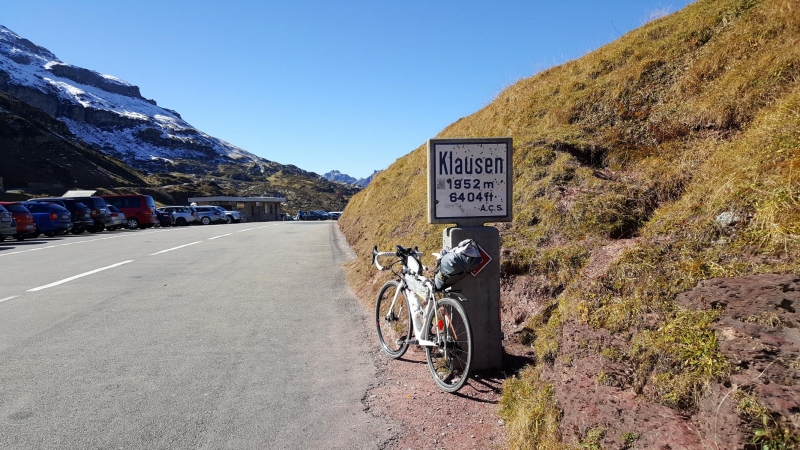 Woran ich allerdings nicht gedacht hatte, war das enge Tal, umgeben von hohen Bergen. Der Himmel war zwar wolkenlos, doch es sollte noch eine Stunde dauern, bis ich endlich an die Sonne kam. Es war eine sehr kalte Stunde. Nach den ersten Spitzkehren zum Klausenpass hinauf, entledigte ich mich aber bereits aller Beinlinge, Armlinge, Windstopper. Ich fuhr vortan in kurz/kurz, bis auf die Passhöhe hinauf.