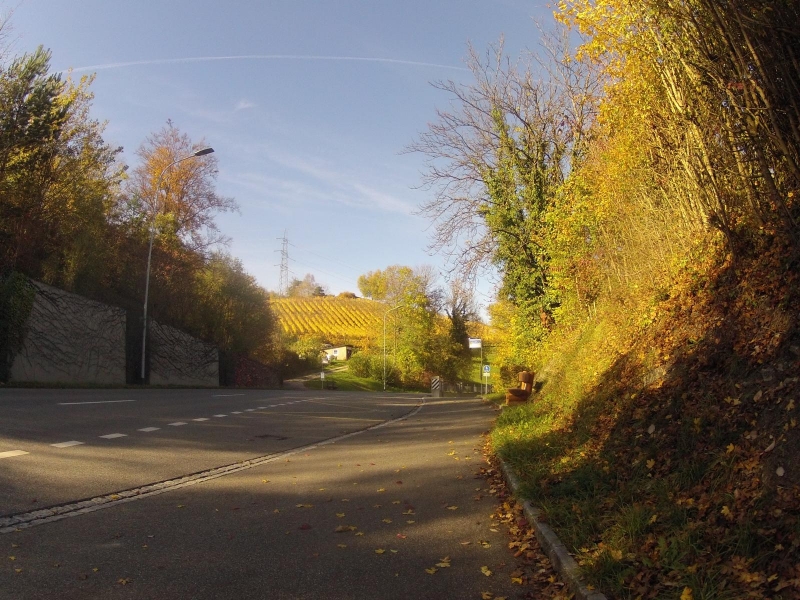 Danach geht es bei Lengnau ins Surbtal hinunter. Mittlerweile ist der Stand der Sonne so tief, dass ich oft im Schatten via Unterehrendingen und das Höhtal nach Ennetbaden hinauf fahre. Doch dann folgt nochmals ein letzter Blick auf die gelben Rebberge oberhalb Ennetbaden, welche heute am späteren Nachmittag nochmals richtig schön von der Sonne beschienen werden.