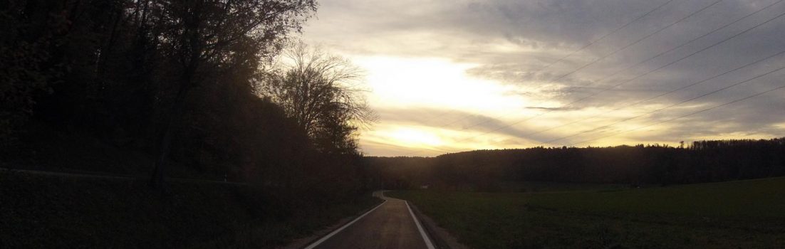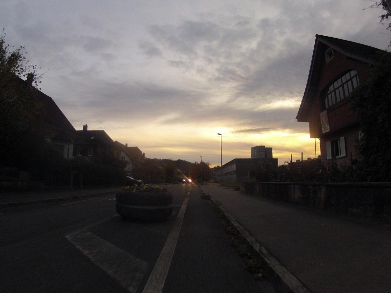 So fahre ich hinter dem Bruggerberg hindurch, in diese Dämmerung, bevor ich bei Riniken die Abfahrt ins Aaretal hinunter nehme und bei den buchstäblich letzten Sonnenstrahlen durch unser Quartier nach Hause kurve.