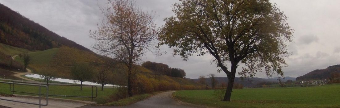 später auf der anderen Seite der Aare wieder zurück bis nach Umiken, ein kleines Stück auf der Bözbergstrasse hinauf, dann um das Villigerfeld. Regen und Wind haben nun das meiste Laub von den Bäumen heruntergeholt. Das Farbigste war heute auf der Strasse wohl das Gelb des Postautos.