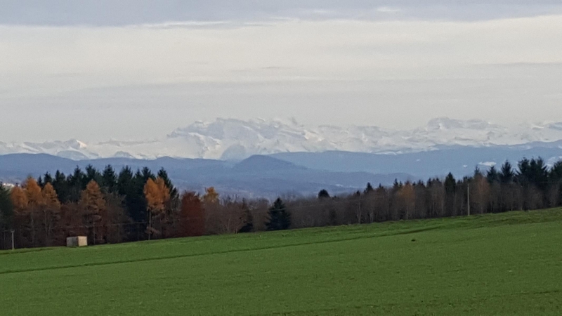 Der Blick nach Süden, über das Reusstal hinweg, lässt wieder einmal den winterlichen Alpenkamm sehr nahe erscheinen. Es muss heute wohl ziemlich fönig gewesen sein. Auch der Blick auf die andere Seite, über das Bünztal und weiter zum Jura, lässt den Jura heute ziemlich nahe erscheinen.