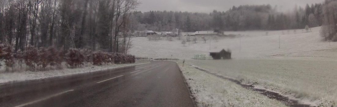 Dicke, schwere, nasse Schneeflocken fielen vom Himmel. Dazu ein bissiger Wind. Meine Brille und die Linse der Kamera am Lenker verklebten sofort. Nur eher zufällig, zwischen Wegwischen und schon wieder neu verkleben, konnte die Kamera doch noch ein paar Schnappschüsse aufnehmen.
