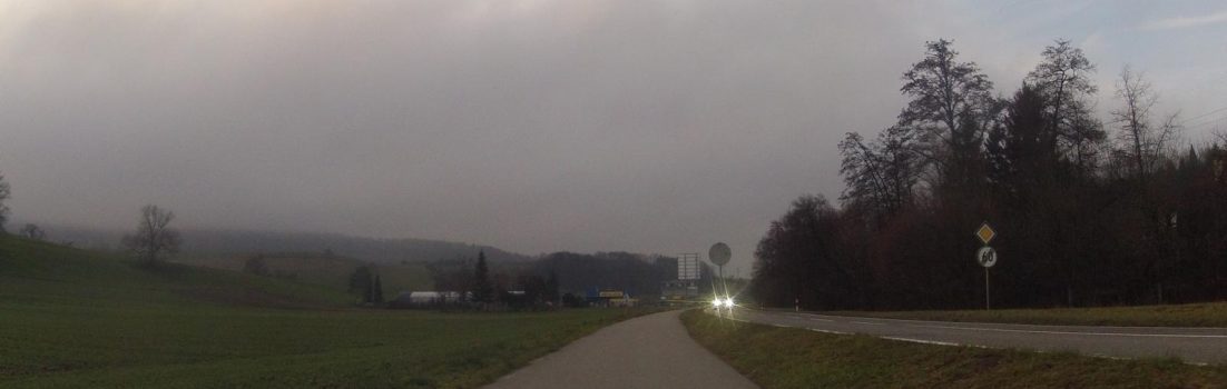 Doch das täuschte. Spätestens in Dättwil musste ich einsehen, dass sich das Loch im Nebel verschoben hatte. Ein weiterer Versuch im Limmattal, etwas mehr von der Sonne zu erhalten als nur gerade ein paar Minuten des Schattenwurfes, misslang ebenfalls. In Killwangen überquerte ich die Limmat, fuhr nach Wettingen zurück. Über der Lägern bildete sich ein schmaler Streifen blauer Himmel zwischen dem Nebel und den Baumspitzen.