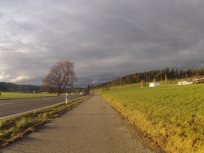 Auf der anderen Seite des Hallwilersees wollte ich wieder zurück fahren. Doch über Lenzburg hingen bereits grosse, dunkle Wolken, während im Tal daneben der Himmel viel freundlicher aussah. Als auf der Strecke bis nach Beinwil am See auch schon erste Regentropfen fielen, hielt ich es nicht mehr aus und fuhr gleich auch noch über den kleinen Hügel hinüber ins Wynatal nach Reinach. Tatsächlich hatte ich Glück mit meiner Routenwahl und konnte schon wenig später an der Sonne fahren.