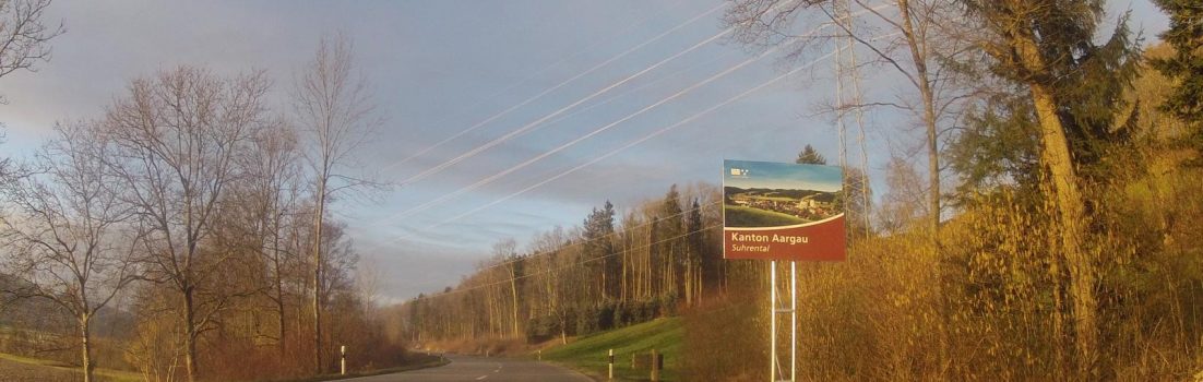 Die Sonne begann sich langsam hinter dem Horizont zu verabschieden. Tauchte aber zuvor die Landschaft noch in ein rötliches Licht. Irgendwie herbstliche Abendstimmung zog über das Land. Bei der Überfahrt der Grenze des Kantons Luzern zum Kanton Aargau gelang meiner Kamera am Lenker noch obiges Foto. In der Regel stehen an der Kantonsgrenze die steinernen Wappen, im Hintergrund rechts sichtbar, und jeweils eine Tafel, hier im Vordergrund. Früher waren das eher stilisierte Tafeln. Wie obiges Beispiel zeigt, ändert sich das möglicherweise in Zukunft. Etwas Änliches ist mir gestern schon bei der Fahrt über die Kantonsgrenze Baselland in den Jurapark aufgefallen. Zufall? Oder gibt sich der Aargau ein neues Aussehen? Mir gefällts.