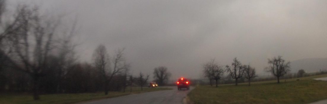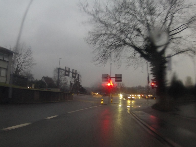 Nach dem die Flocken schon den ganzen Tag vom Himmel fielen, die meisten aber sofort zu Wasser zerfielen, hellte es gegen Abend etwas auf. Glaubte ich wenigstens. Denn kaum war ich auf der Strasse, fielen schon weitere Flocken vom Himmel. Wobei es sich eigentlich nur um weissen Nieselregen aus der Nebeldecke handeln konnte. Denn bald waren die Strassen nass wie nach Regen, ohne dass, weder die Felder noch die Strassen, weiss wurden.