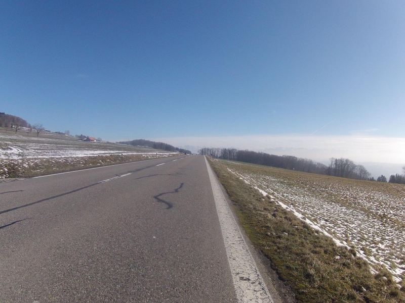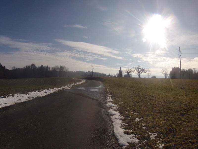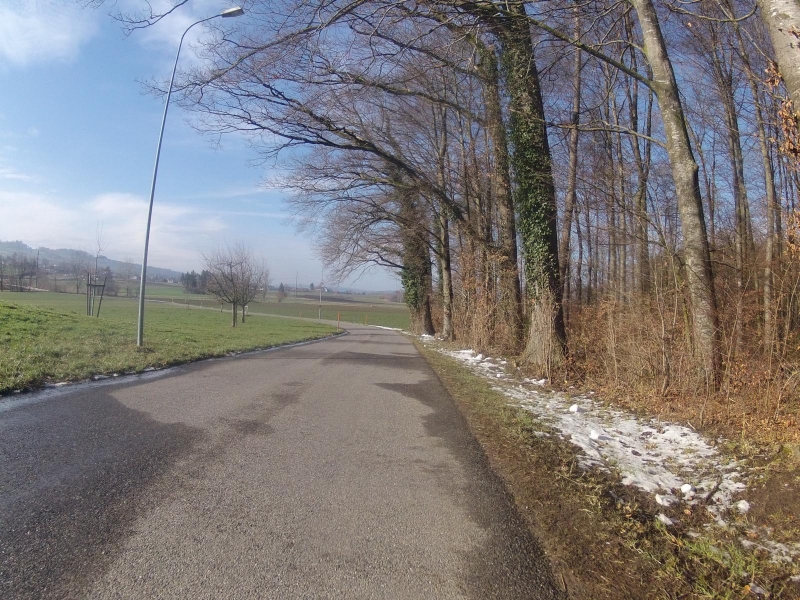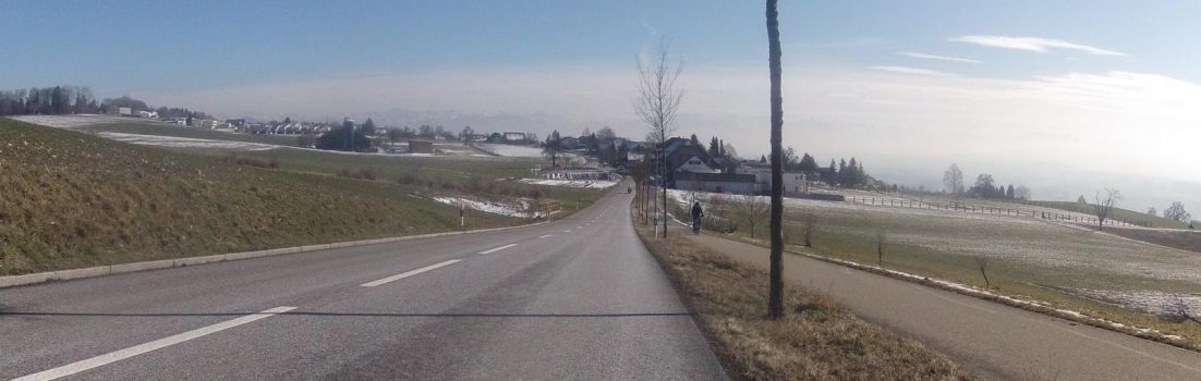 Ausser durch Wohlen und später durch Dottikon, führte der Weg alles etwas aussen herum, teils auf Radwegen, fast immer auf wenig befahrenen Strassen. Ich genoss es, an der Sonne zu fahren, ohne kalte Füsse, manchmal sogar mit etwas Rückenwind. Diese Idylle dauerte fast bis nach Hause. Auf den letzten Kilometern entlang des Birrfeldes gelangte ich schon wieder unter einen bewölkten Himmel, der sich langsam über den Jura schob. Die nächsten Niederschläge sind ja schon prognostiziert.