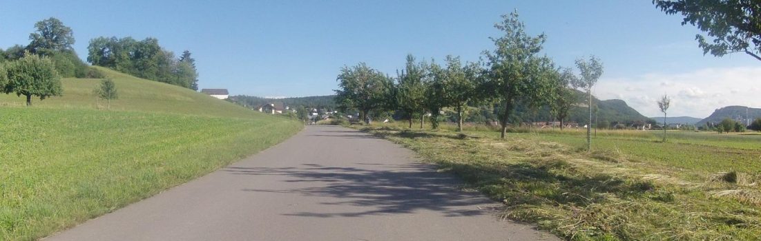 Auch bei der Abfahrt von der Staffelegg da kümmerte ich mich nicht um Radwege. Ich liess es einfach laufen, gelangte in das Fricktal hinunter. Kurbelte bis Eiken. Erst dann legte ich bewusst die Radwege unter die Räder meines Renners. Ich folgte ab jetzt der Radroute 2 (Rhein-Route), mehr oder weniger in Griffnähe des Rhein wieder aufwärts. Es ist die Strecke, die ich gerne als Rollerstrecke bezeichne.