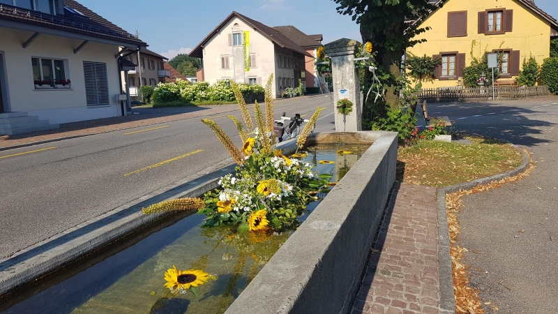 In Murgenthal überfahre ich wieder die Kantonsgrenze. Es folgen Rothrist, Oftringen, Safenwil, Kölliken und Suhr. In der Zwischenzeit sind beide Bidons leer getrunken. Da ich weiss, dass es in Rohr sicher einen Brunnen mit frischem Wasser hat, verlasse ich die Radroute 34 in Suhr, und kurble hinüber zu dem frischen, kühlenden, Nass. Der Brunnen ist wohl noch seit dem letzten Jugendfest verziehrt.