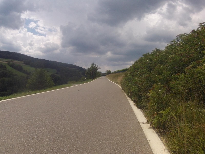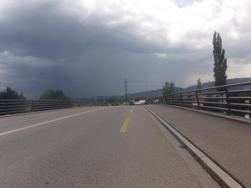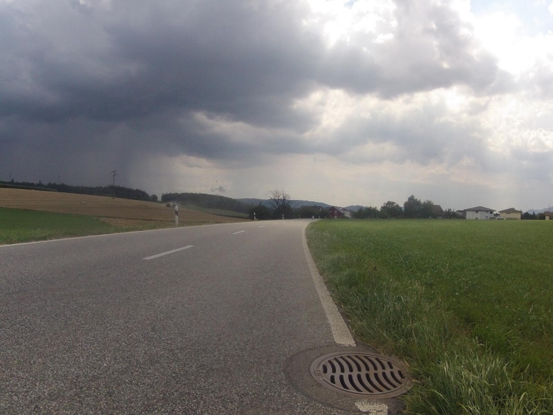 Als ich mich auf den Renner setzte, war es über dem unteren Aaretal schon bedenklich schwarz am Himmel. Es blieb mir nur noch der Weg Aareaufwärts. Da mir das allerdings zu einfach erschien bog ich in Schinznach-Dorf doch ins Schenkenbergertal hinein, hinauf zur Staffelegg. Es dauerte denn auch nicht lange, bis ich von Gewittern umgeben war. Dasjenige vom unteren Aaretal hatte der Wind näher geblasen und vor mir schien eines über den Jura ins Mittelland hinausziehen zu wollen.