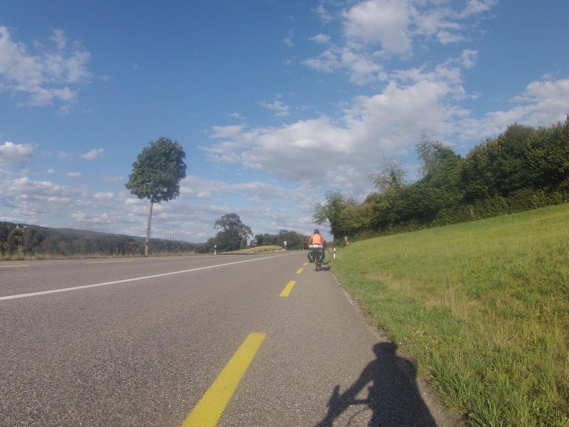 Ich biege hier rechts ab, fahre eine Weile hinunter in Richtung Fricktal, später im Fricktal noch weiter nach Norden bis ich in Eiken zum zweiten rechten Winkel der heutigen Rundfahrt komme. Nach diesem Richtungswechsel folge ich der Radroute 2 (Rhein-Route), mehr oder weniger in der Nähe des Rheins, bis hinauf zur Aaremündung.