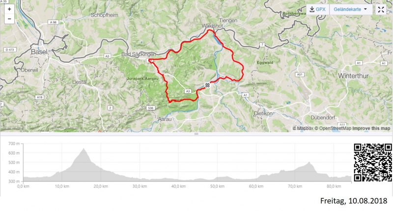 Trotz einiger Kurven, und sogar Spitzkehren an der Staffelegg, zeigt sich auf dem Übersichtsbild die Fortsetzung der ziemlich geraden Linie, allerdings weg von der Aare, bis auf die Passhöhe der Staffelegg. Da kommt es dann zum ersten rechten Winkel in der heutigen Rundfahrt.