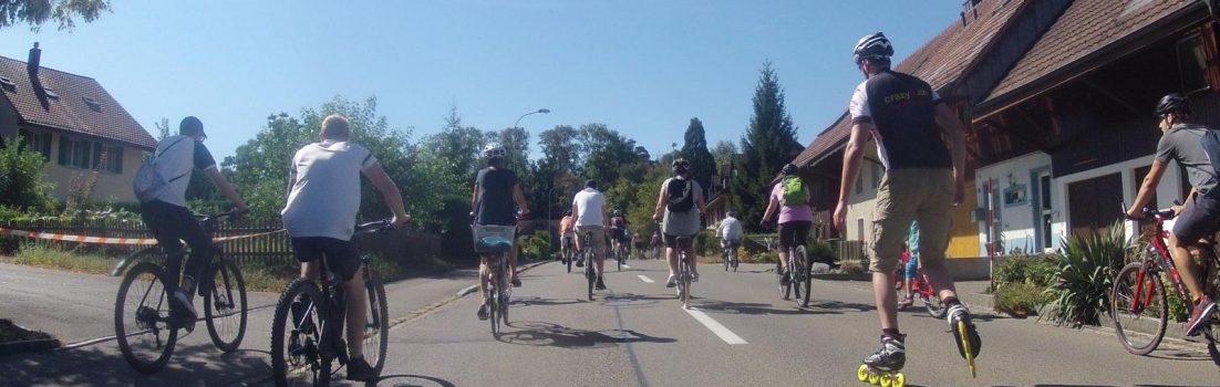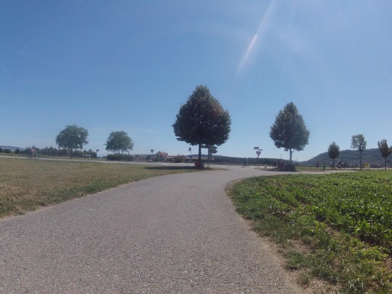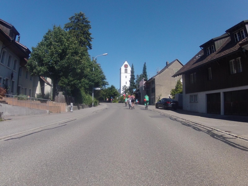 in grossem Bogen um das Schinznacherfeld herum und gelangte so bei Villnachern wieder auf die Strecke des Slow Up’s. Am Nachmittag waren die Strassen nun deutlich leerer als am Morgen, dafür die bereitgestellten Festbänke viel besser besetzt.