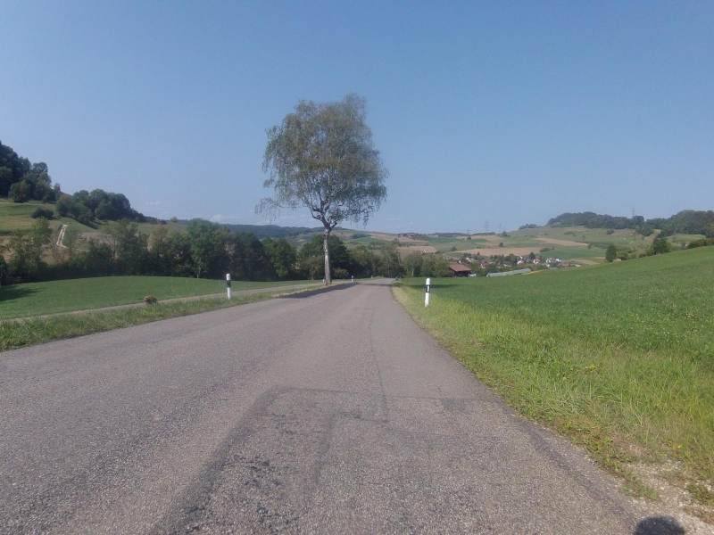 Die Zeit reicht noch für einen kleinen Umweg. So fahre ich heute nicht einfach längs durch das Birrfeld, sondern eher diagonal, gelange damit bei Scherz auf einen etwas erhöhten Punkt und damit auch zu einer schönen Sicht hinüber zur Ortschaft Hausen.