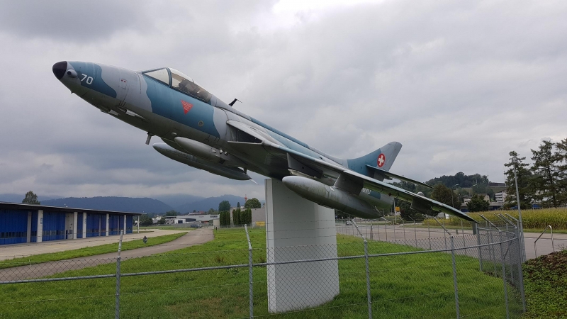 Ich fahre heute nicht ganz nach Luzern hinein. Biege bei Emmen-Dorf von der Radroute weg, umfahre das Ende der Landepiste des Militärflugplatzes in Emmen und gönne mir bei einer kleinen Aussichtsterrasse eine Pause.