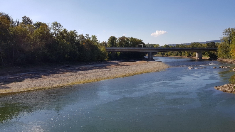 Einigermassen erschrocken hielt ich hier inne. Wahrscheinlich habe ich noch nie so einen tiefen Wasserstand gesehen. Jedenfalls ist mir diese Kiesbank in dieser Breite neu. Die Brücke im Hintergrund ist ein Viadukt der Autobahn A3, welche sich hier vom Habsburg-Tunnel über das Aaretal hinüber zum Bözberg-Tunnel schwingt.