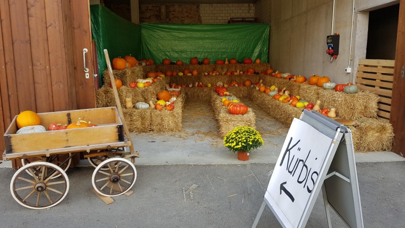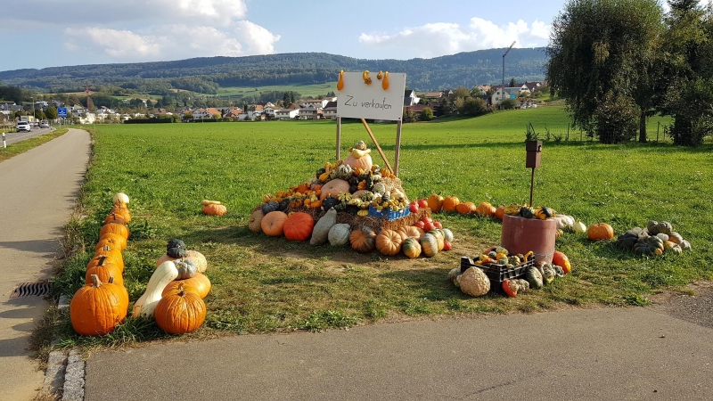 Ich benutzte fast ausschliesslich Radwege. Fuhr durch Dörfer wie Tegerfelden, Endingen oder Lengnau. Ich passierte einige Hänge mit Rebstöcken. Teilweise sind die Trauben bereits abgelesen, andere hängen noch an den Stöcken. In den Dörfern schmeckt es manchmal nach frisch gepressten Trauben. In einem Schopf entdeckte ich eine Auslage an Kürbissen zum Verkauf.
