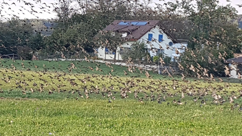 Da spielt sich auf einer Wiese eine eigenartige Szene ab. Hunderte, wenn nicht gar tausende von Vögeln schwirren hier einigermassen aufgeregt hin und her. Manchmal sitzen sie kaum sichtbar auf der Wiese im Gras um nur Sekunden später auf zu steigen und sich am anderen Ende der Wiese wieder niederzulassen.