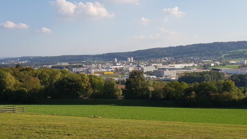 Es reicht für einen kurzen Blick hinüber in Richtung Neeracher Riet und das Gelände des Flughafens, bevor die Strasse wieder hinunter und später um die Lägern herum nach Dielsdorf abbiegt. Nochmals eine kurze Steigung, eine weitere Abzweigung auf der Höhe und schon sieht man hinunter auf das oberste Ende des Furttales.
