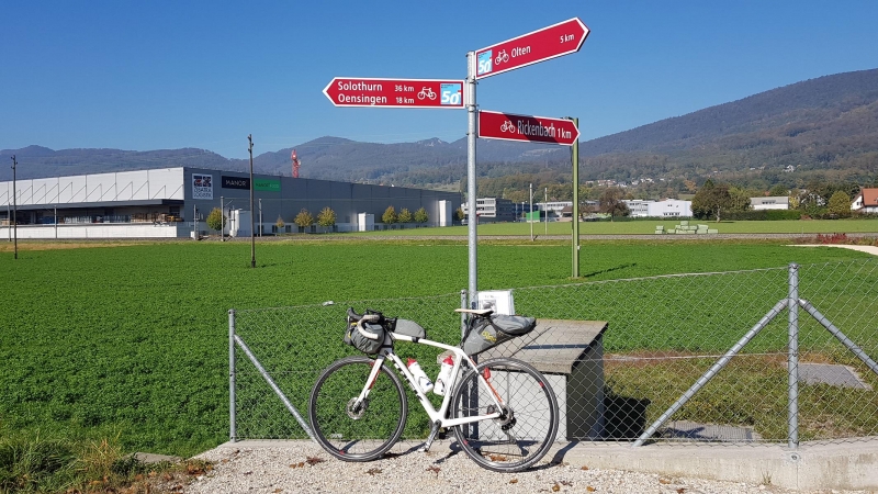 Ich wollte nicht wie sonst üblich auf der Hauptstrasse dem Jurasüdfuss entlang nach Westen fahren. Ich benutzte von allem Anfang an die Radroute 50 (Jurasüdfuss-Route). Wie erwartet fahre ich so den grössten Teil auf fast leeren Strassen und Strässchen. Ein paar Kilometer sind nicht asphaltiert, lassen sich aber gut befahren. Meist führt die Strasse weit um die Dörfer herum, manchmal parallel zur Eisenbahnlinie, manchmal parallel zur Aare, wo sie denn auch ein paar Kilometer die Strecke mit der Radroute 8 (Aareroute) teilt.