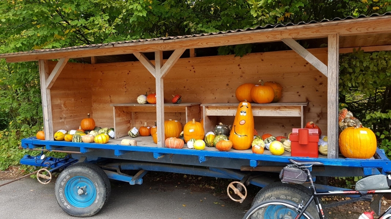 Irgend einmal stellte ich die Kamera am Lenker ab. Es machte wohl keinen Sinn mehr, graue Wände zu fotografieren. Da kam mir der Kürbiswagen nach Dielsdorf, am Übergang vom Surbtal ins Furttal gerade gelegen. Ein Farbtupfer während der heutigen Fahrt unter der grauen Decke.