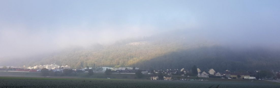 Ich fuhr das Aaretal hinunter bis nach Döttingen, dort wo das Surbtal ins Aaretal einmündet. Ich hoffte, dass die Surb als kleines Bächlein wohl nicht so viel Nebel mit sich bringt wie Aare, Reuss und Limmat, die drei grossen Flüsse, welche sich in unserer Gegend vereinigen.