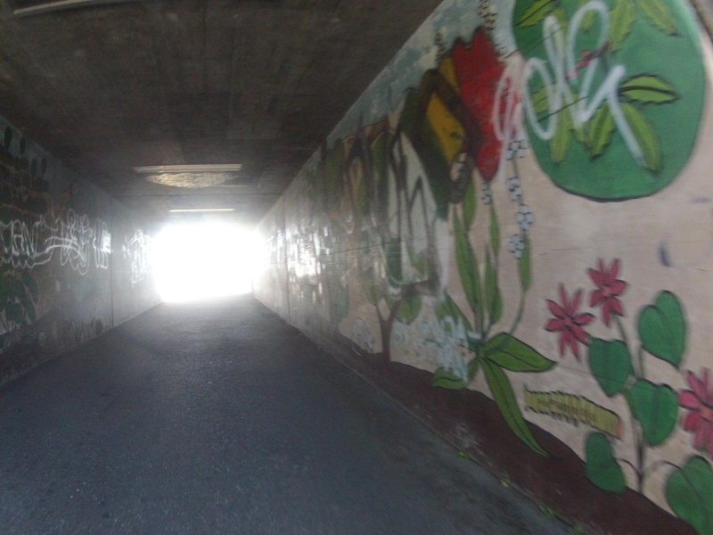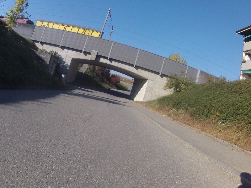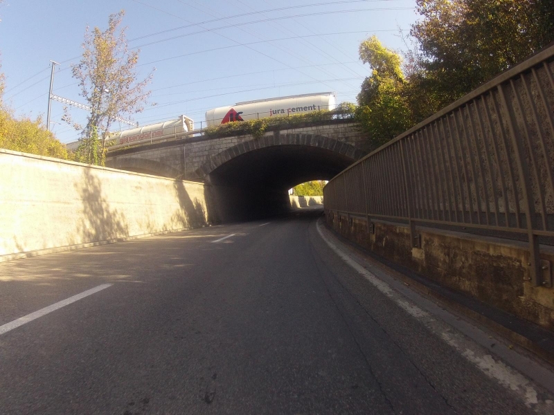 Wenige Meter später geht es schon wieder unter einer Brücke hindurch. Die SBB fährt darüber. Teils als Zubringer zum Zementwerk aber auch Schnellzugsverbindung nach Aarau. Die Brücke überspannt auch die Bünz, welche ganz links hinter der hellen Mauer fliesst.