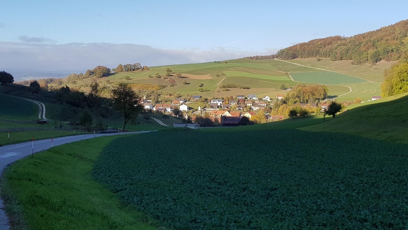 dann nochmals weiter quer über die Hügel, bis ich oberhalb Fisibach einen ersten Blick ins Rheintal hinunter werfen konnte.