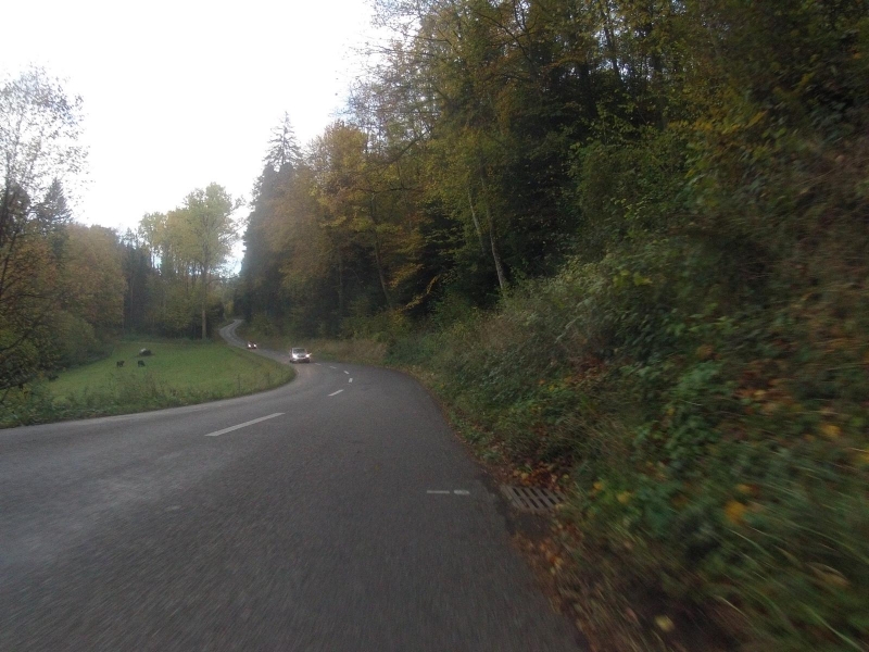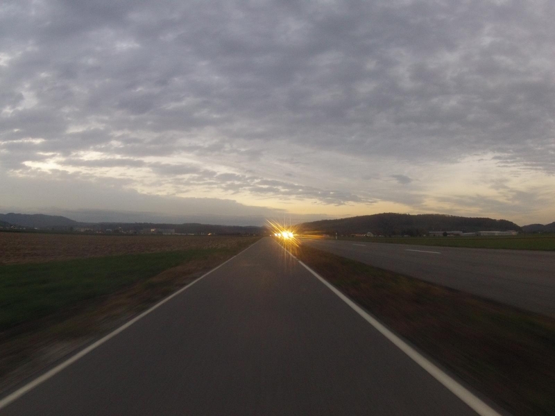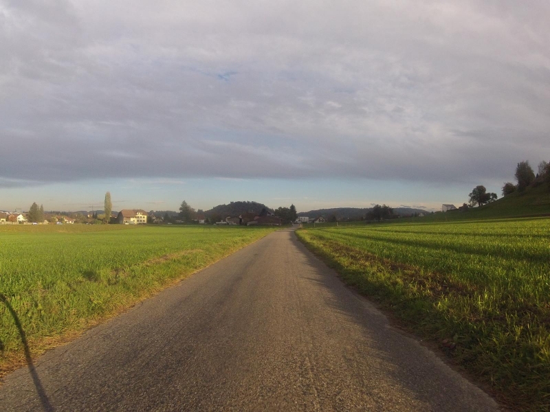 Nach diesem Hügel auf dem obigen Foto komme ich schon bald ins Bünztal hinunter. Langsam wird es immer dunkler. Eine der letzten, noch brauchbaren Fotos schiesst meine Kamera am Lenker bei der Fahrt über das Birrfeld.