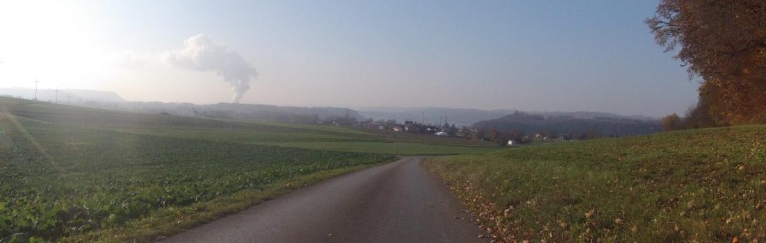 Ich fuhr zuerst im Aaretal hinunter, der Nebelgrenze entlang. Als dann feststand, dass ich in die nördliche Richtung wohl länger an der Sonne fahren konnte als in die südliche Richtung, fuhr ich weiter im Aaretal hinunter, vorest nach Würenlingen. Da wechselte ich über die Anhöhe hinüber ins Surbtal und später noch über den Zurzacherberg ins Rheintal nach Bad Zurzach hinunter.