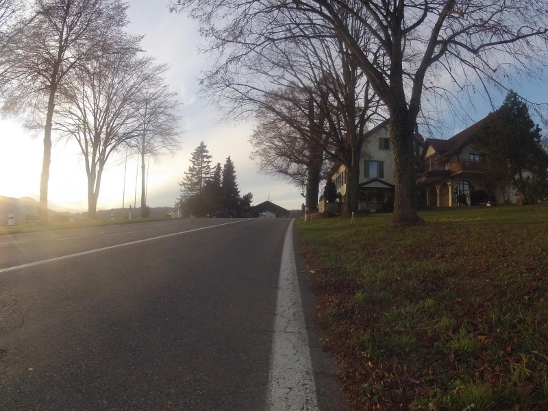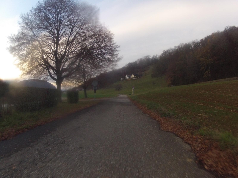 an den Fuss des Bözberges. Eigentlich in der Hoffnung, dass in der Höhe die Sonne etwas länger scheinen würde. Doch die Sonne, auf ihrer herbstlich tiefen Laufbahn, versinkt schon bald hinter den Jurabergen. Die Passhöhe des Bözberg passiere ich gerade noch im Licht der letzten Sonnenstrahlen.