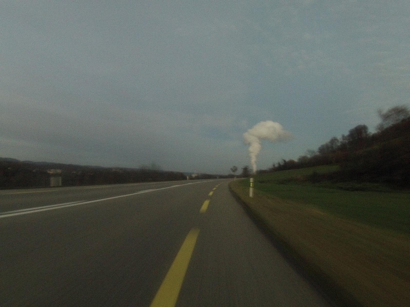 Ich fahre das Fricktal bis nach Eiken hinunter und fahre ab dann auf weiteren Radwegen oder mindestens Radstreifen mehr oder weniger dem Rhein entlang hinauf, zurück in Richtung Aaretal. Das letzte noch brauchbare Foto schiesst die Kamera am Lenker in der Nähe von Schwaderloch, mit Blick auf die Dampffahne des Kernkraftwerkes in Leibstadt.