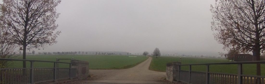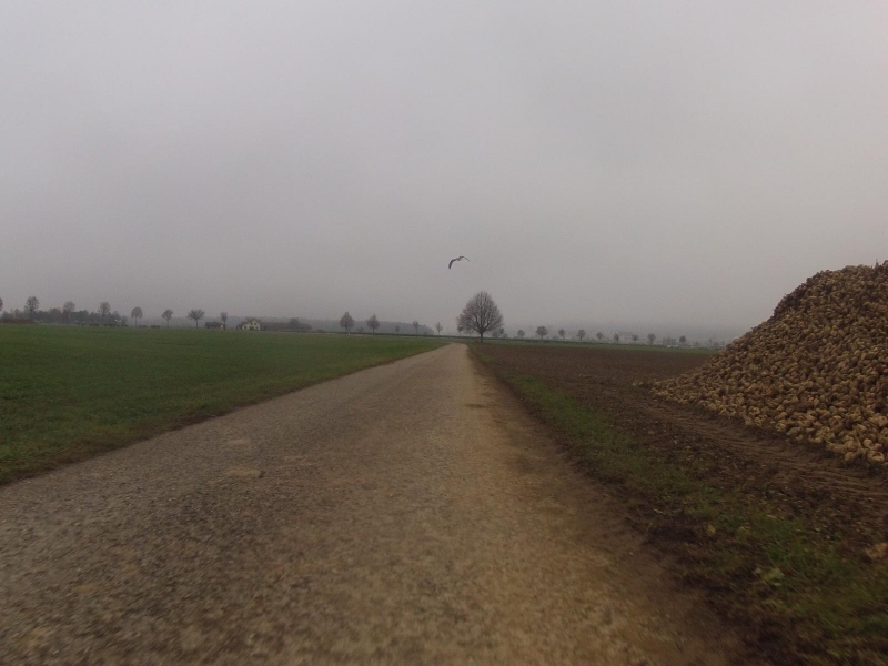 Wieder alles beim Alten. Der Nebel ist wieder da, die Kälte auch. Ich verlasse unsere Quartiere für die heutige Runde in südlicher Richtung, über das Birrfeld in Richtung Reusstal. Da fliegt eine Weile lang ein Mäusebussard neben mir her, setzt sich auf einen Berg Zuckerrüben, fliegt dann aber wieder weiter und kreuzt das Sichtfeld meiner Kamera am Lenker.