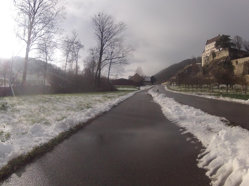 Der erste Schnee in diesem Winter, der auch bei uns im Flachland liegen blieb. Wenigstens eine Weile lang, denn es tropfte schon bald beachtlich von den Bäumen herunter. Als dann nach dem Mittagessen für eine kurze Zeit sogar noch ein paar Sonnenstrahlen den Weg in unser Quartier fanden, da stand ich sehr rasch mit dem Rennrad auf der Strasse.