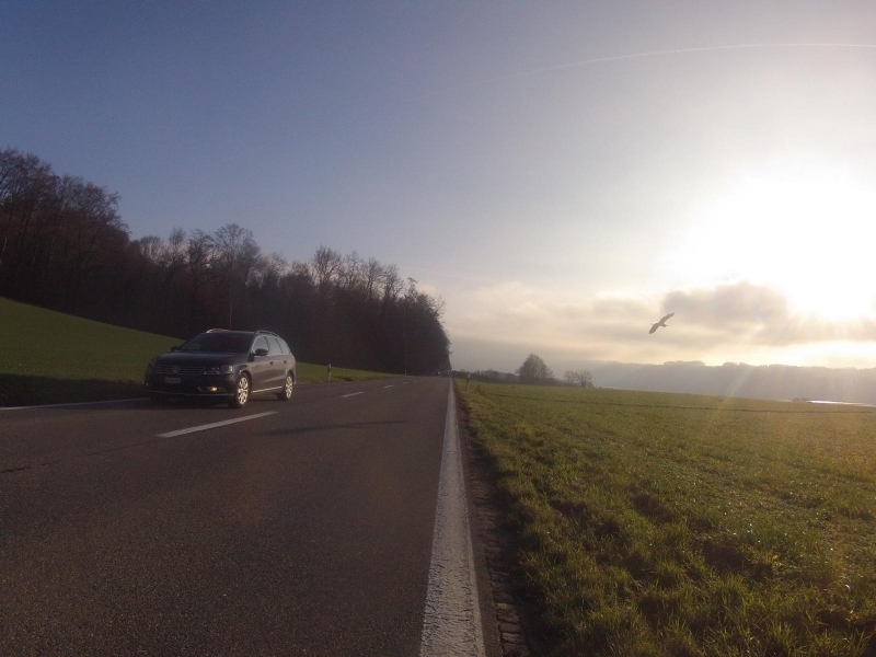 Tatsächlich, kurz vor Seengen war die Sonne so stark, dass es sogar für einen Schattenwurf auf der Strasse reichte. Während der ganzen Fahrt entlang des Hallwilersees blieb das auch so.