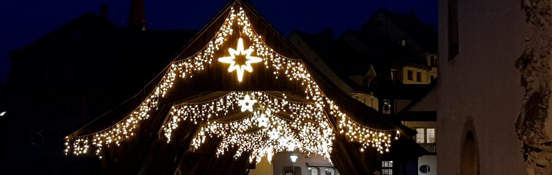 Mittlerweile ist die Nacht hereingebrochen. Ich bleibe auch jetzt auf den Radwegen, weiter das Reusstal hinunter. In den Dörfern sind viele Häuser mit leuchtenden, flackernden Dekorationen versehen. Projektoren werfen kreisende Sterne und weitere Symbole an die Hauswand. Ich sehe viele sehr schöne Dekorationen, einige treffen meinen Geschmack nicht so gut.