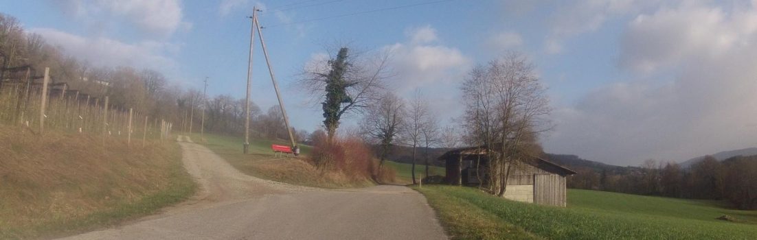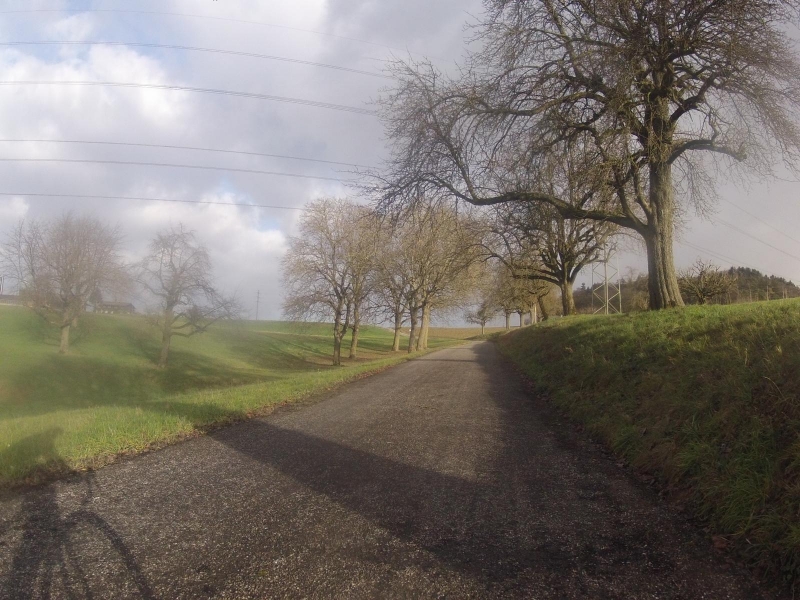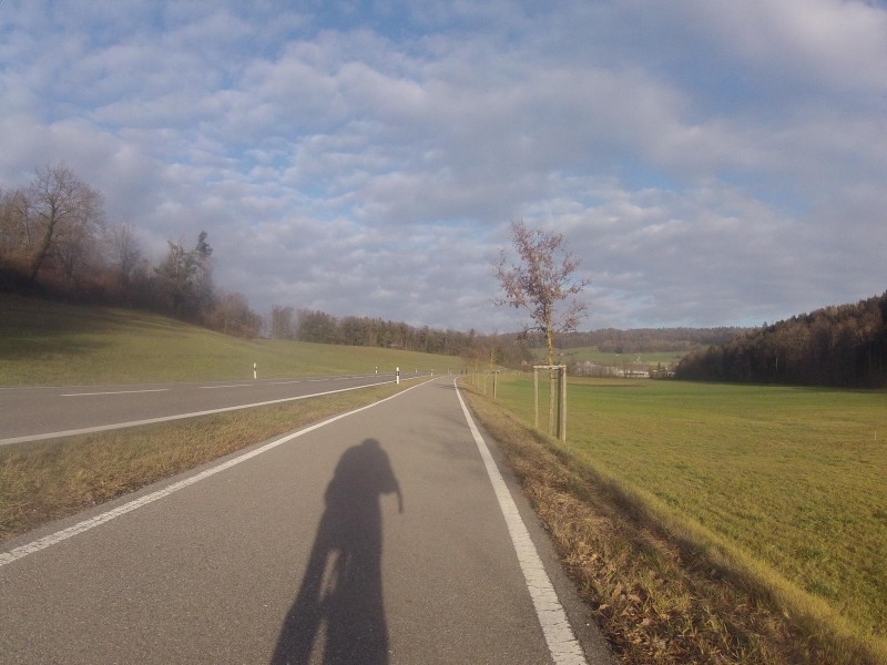Die verschwommene Stelle auf dem Foto rührt wohl von einer Schneeflocke her, die sich an der Linse verklebte oder gerade wegschmolz. Ich rollte das Surbtal hinauf, liess mich grösstenteils von einem leichten Rückenwind etwas schieben und genoss es, wieder einmal an der Sonne, statt nur unter der Nebeldecke fahren zu können.