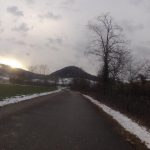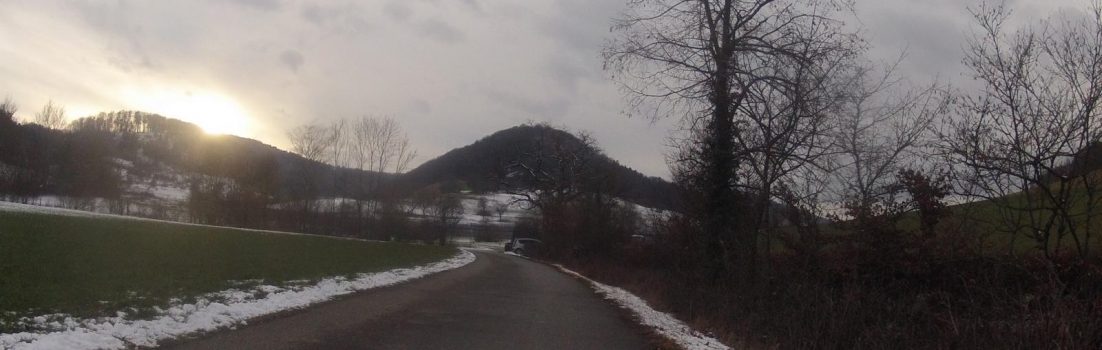 Danach ging es durch eisig kalten Fahrtwind schon wieder hinunter nach Remigen und zurück an den Rand des Villigerfeldes. Während der Abfahrt ergab sich ein merkwürdiges Stimmungsbild. Der dunstige Himmel, im Rücken vermutlich etwas Abendrot und in Blickrichtung nach Osten das Ende der Wolkendecke. Rechts der Schattenhang noch mit einer Schneedecke.