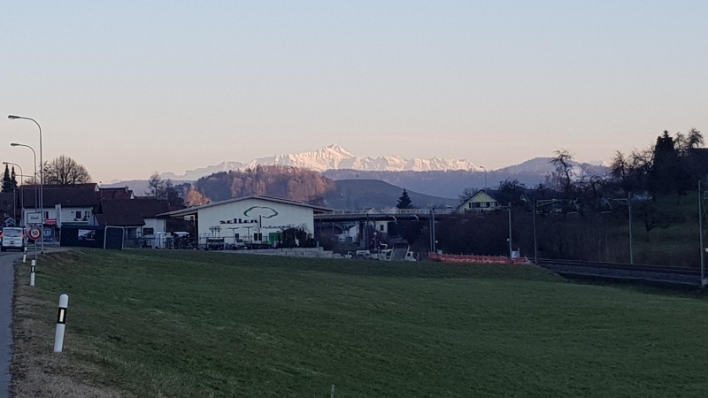 Kurz vor Ende der Fahrt, geht es nochmals über eine letzte Anhöhe. Ich konnte es nicht sein lassen, auch diesen Anblick des Alpenkammes im abendlichen Licht fest zu halten.